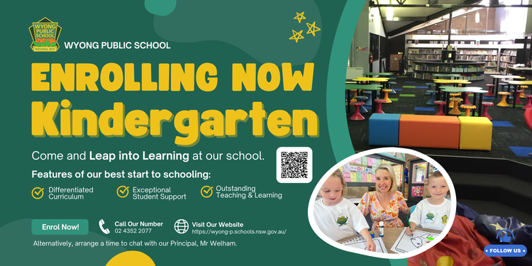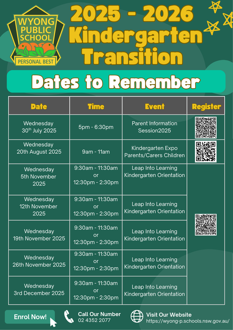 At Wyong Public School we offer a range of Kindergarten transition activities to support preschool children and their families as they begin school for the first time. Starting this transition journey is an important step, as it helps children get to know their teachers and school, gives parents the chance to connect with our community, and allows us to partner with families to prepare for each child’s individual needs. Please contact us if you have any questions.